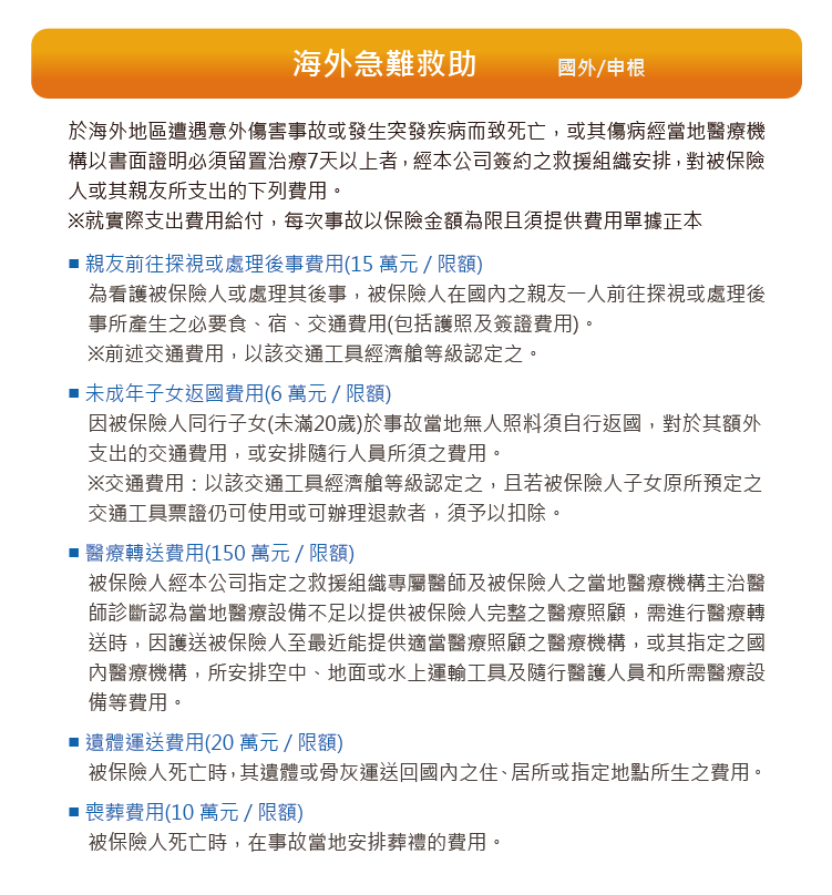 商品名稱:華南產物旅行綜合保險、旅行綜合保險附加旅行平安保險、旅行綜合保險附加旅行平安保險傷害醫療保險給付附加條款、兒童旅行傷害醫療保險附約、海外突發疾病醫療健康保險附約(甲型)、華南產物海外突發疾病醫療健康保險附約(乙型)、海外急難救助附加條款、傷害保險恐怖主義行為保險限額給付附加條款、賠償責任期間約定附加條款、班機改降補償保險附加條款、信用卡盜用損失補償附加條款